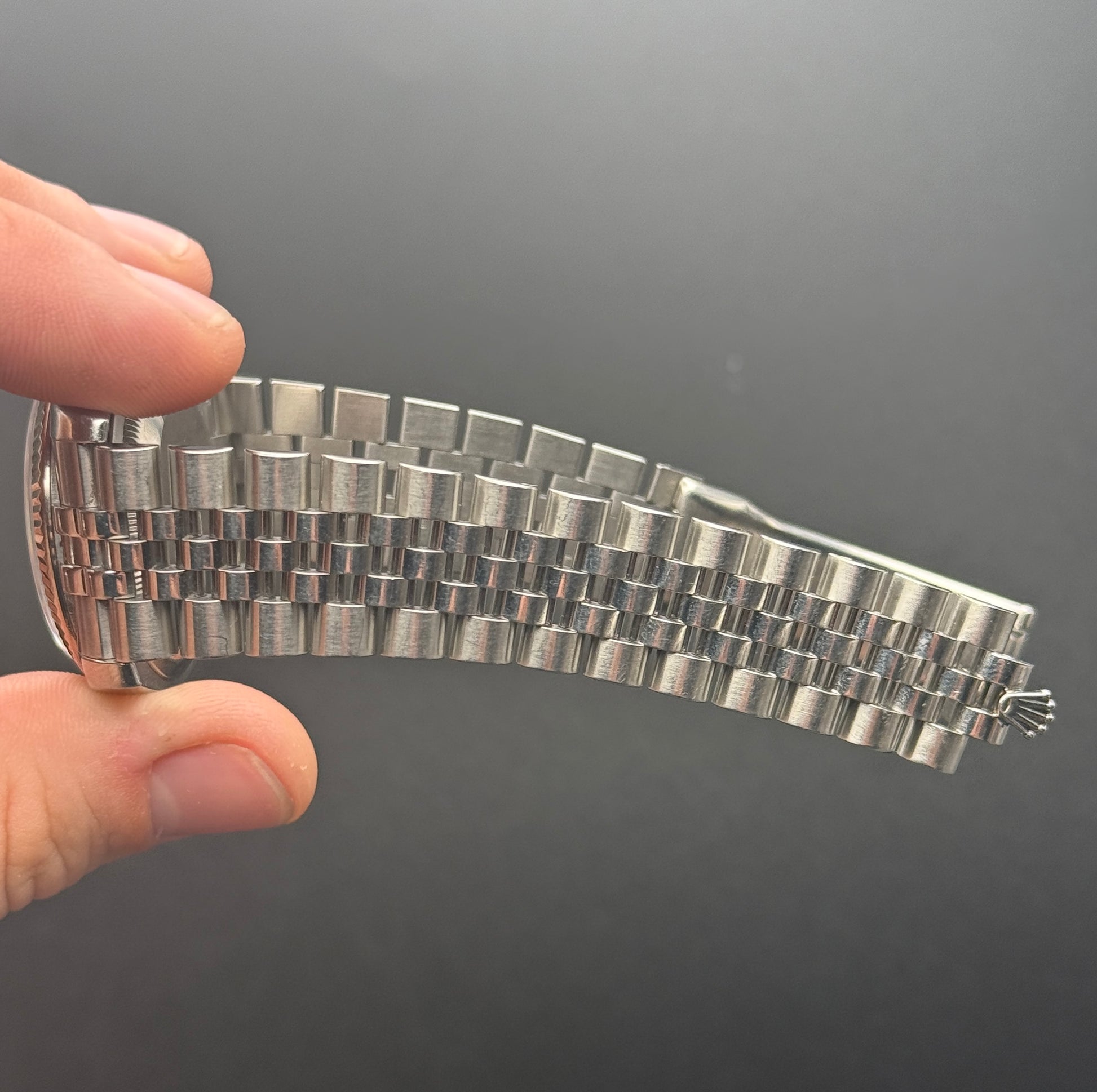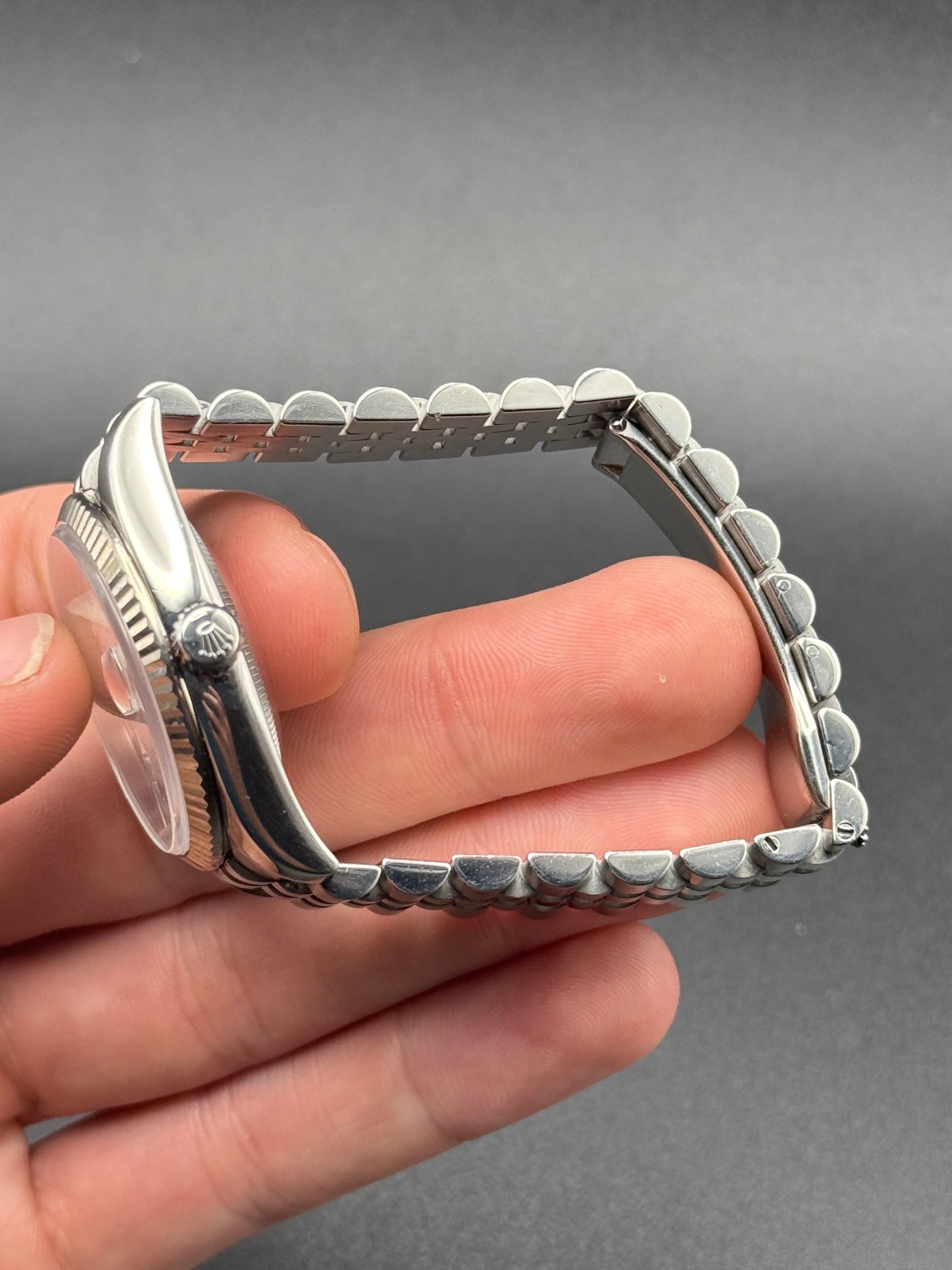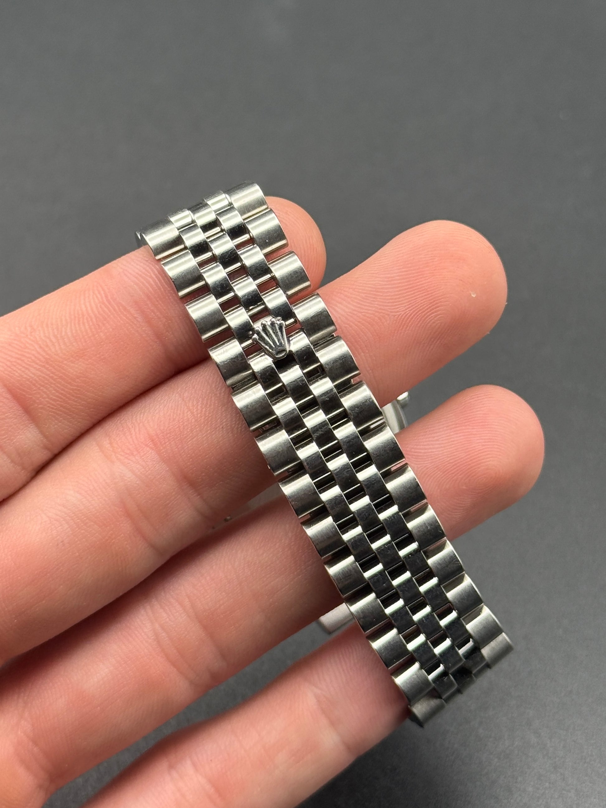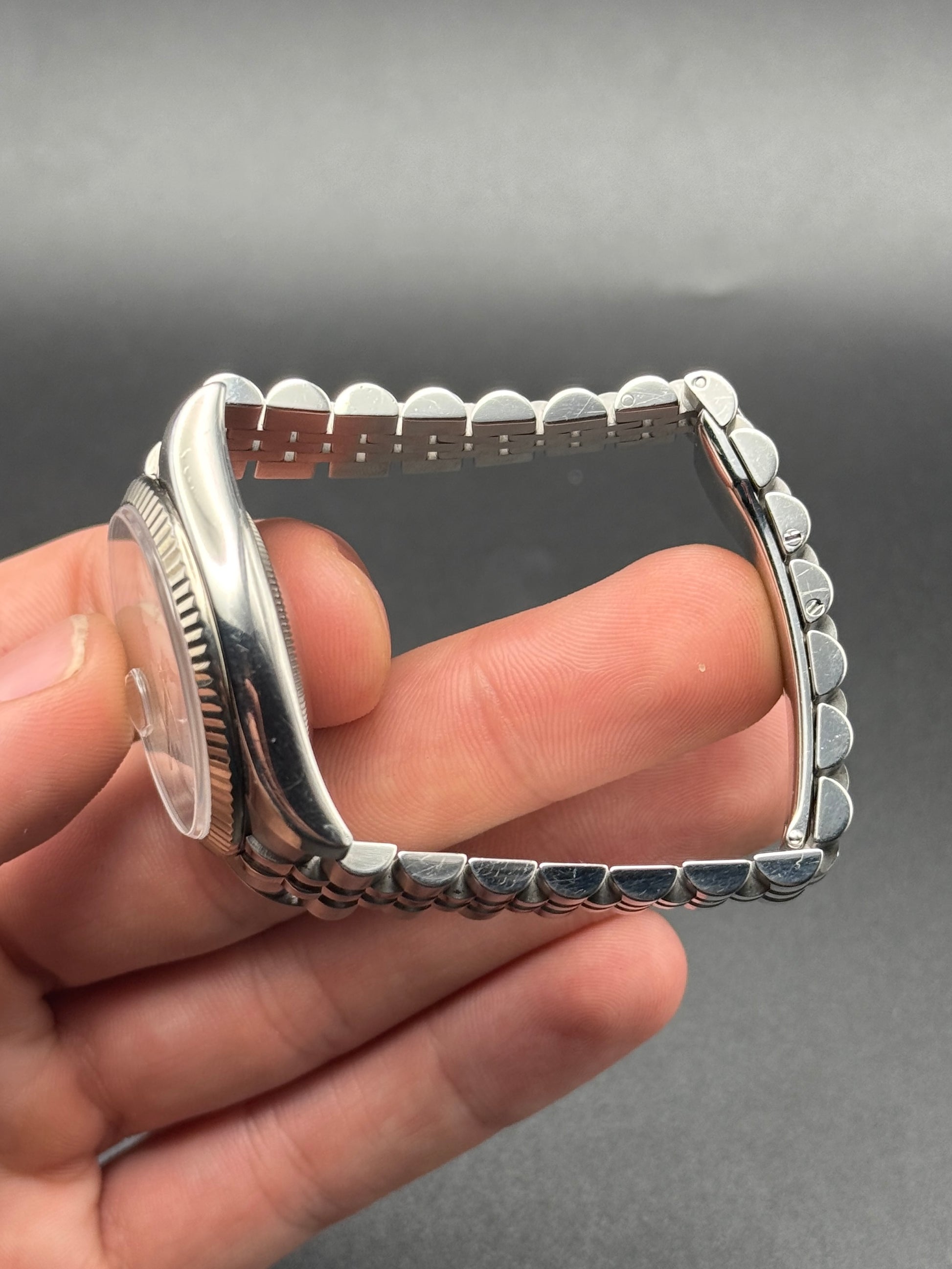 Pretty daily for grabs today, white roman dial D8-Just on super jubilee. Minor scratching throughout, light detail for RR. 21 links; watch only.
