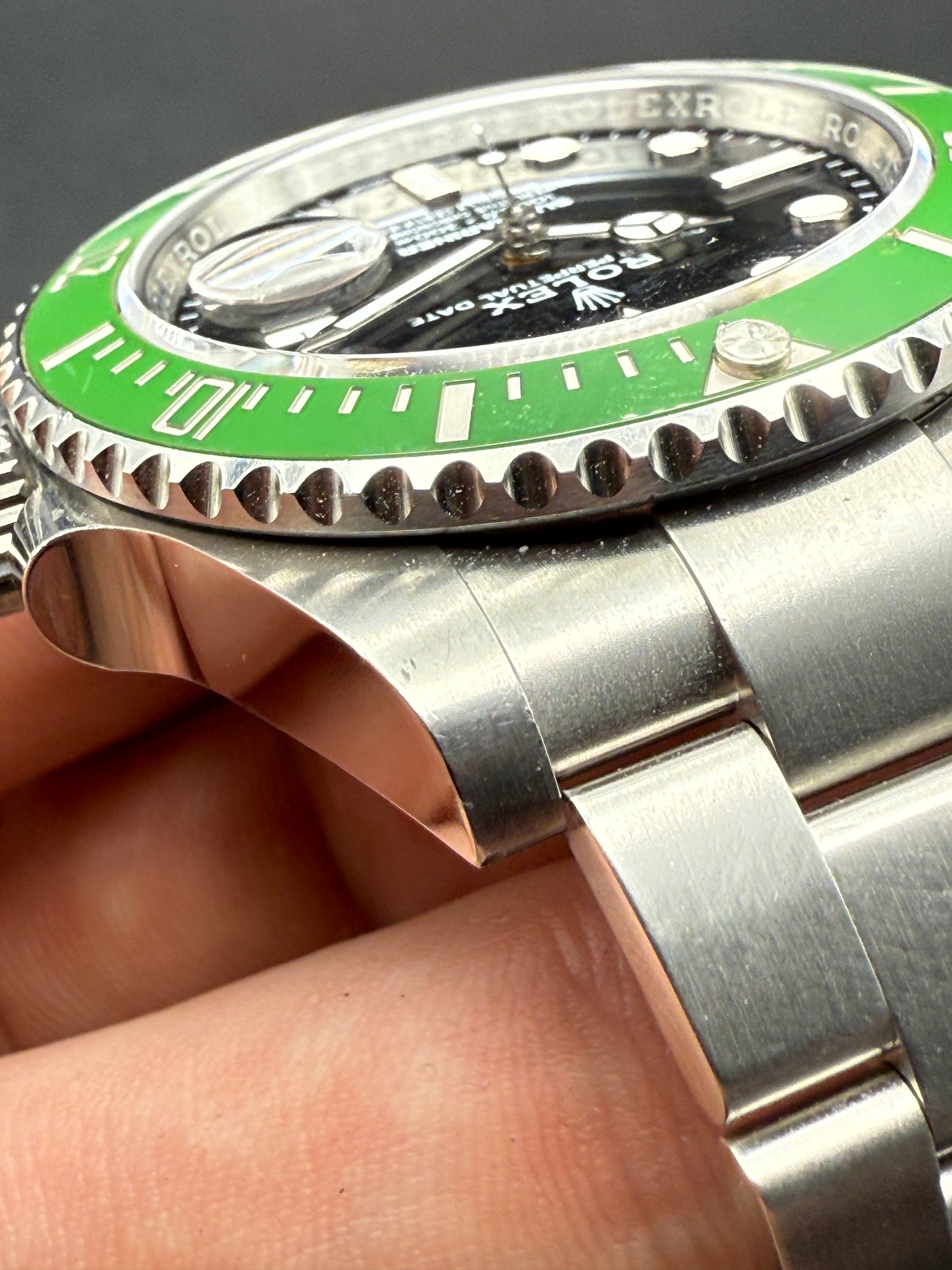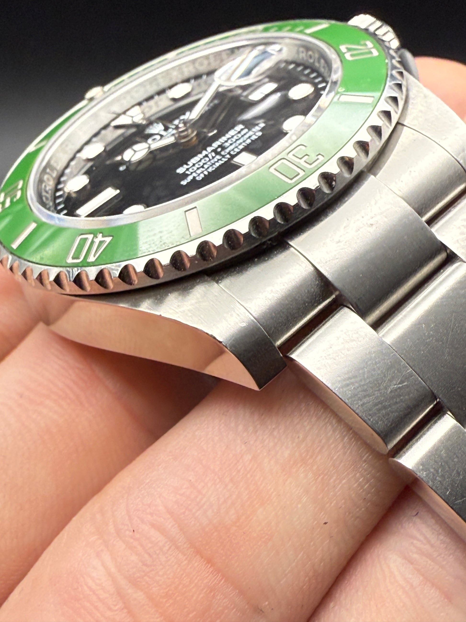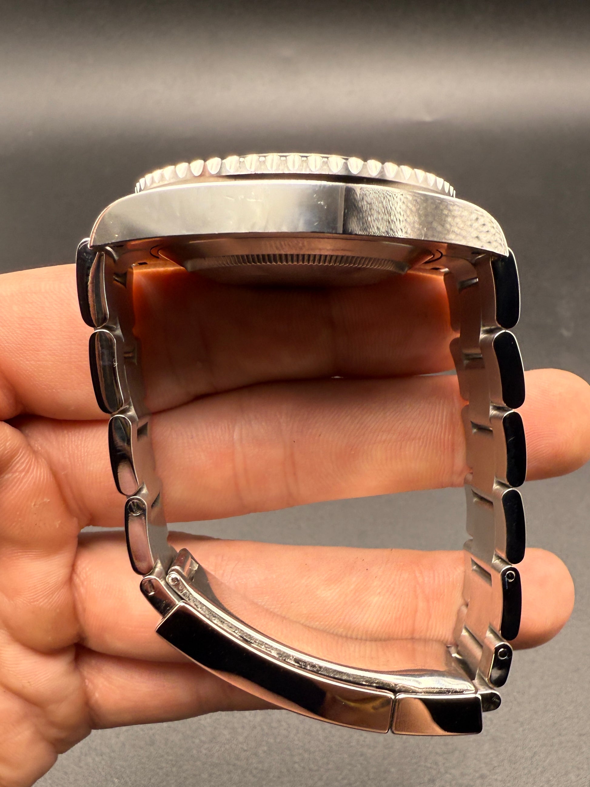 For sale is a Sub D8 “Starbuckz” offered at a great discount. The watch is thick condition with a few light dings on the lugs and light scratching throughout. The insert shows a few marks, including a scratch at the “15” marker and a cracked insert pearl. There is also a light scuff on the cyclops. Running great and priced as a budget-friendly modern piece.