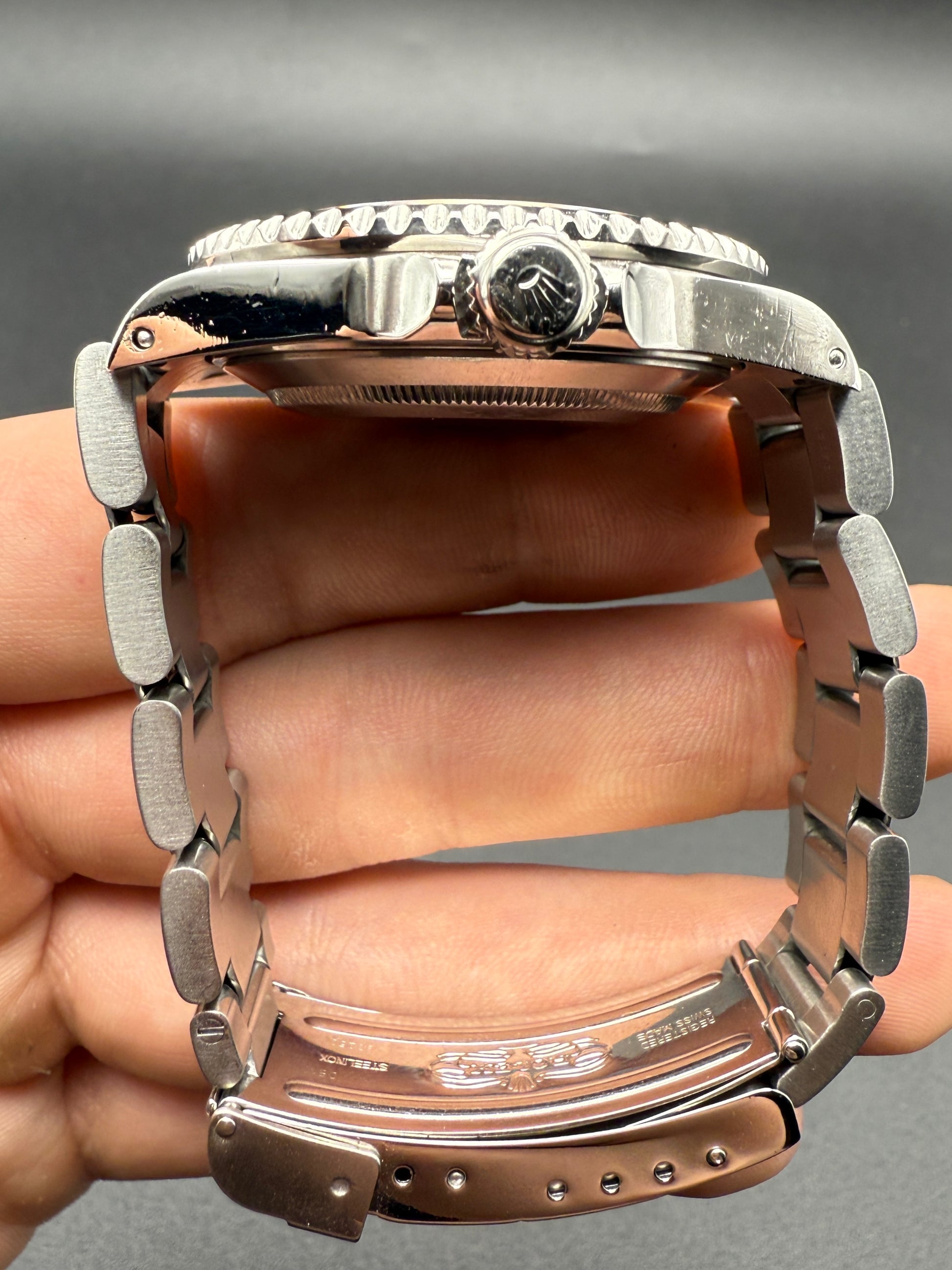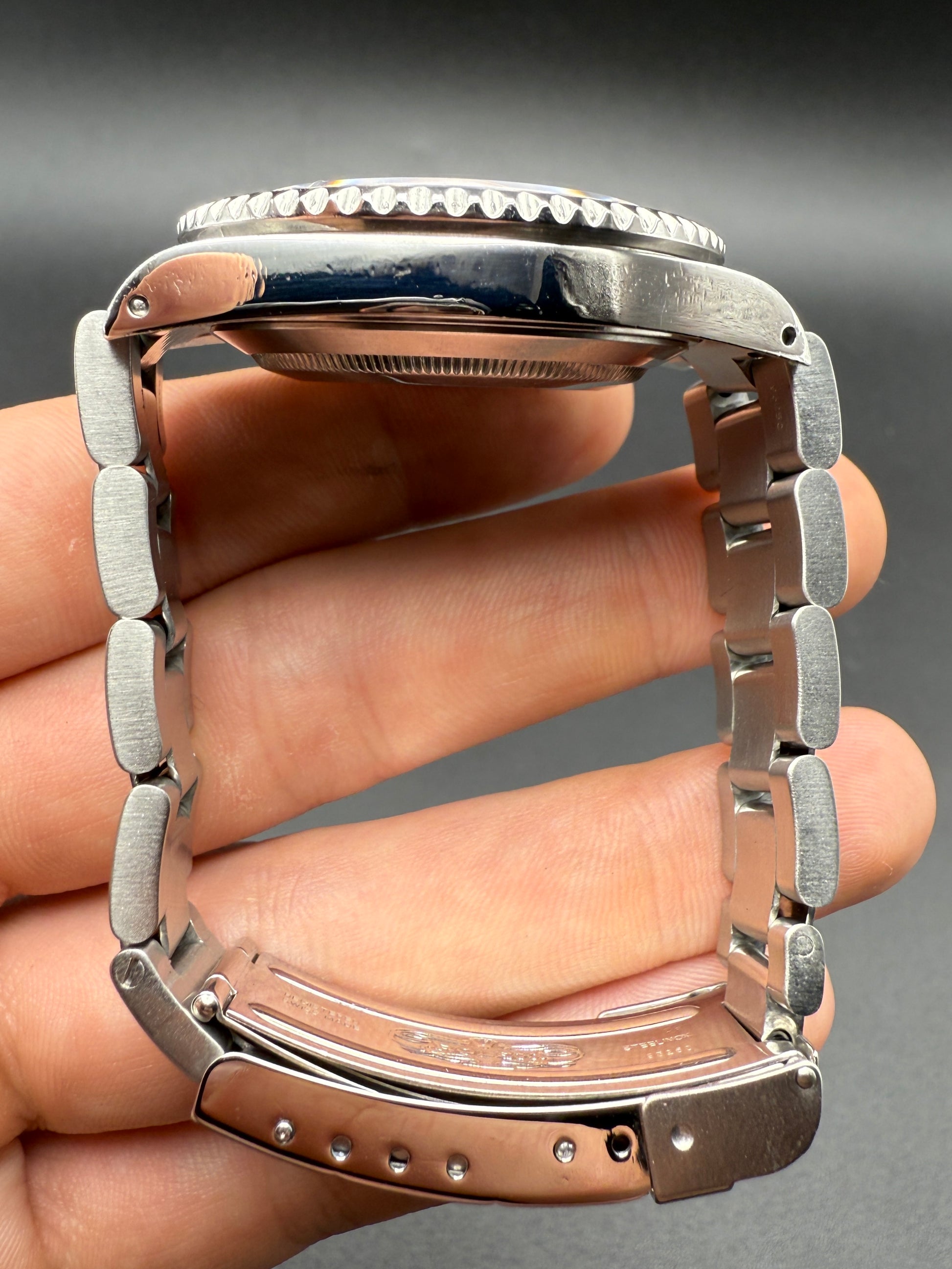 For sale is a solid end link Sub Date. Previously worn and loved, but the case remains sharp. The insert has started to age into a nice blue color. Marks throughout and the bracelet shows some wear in the pins.