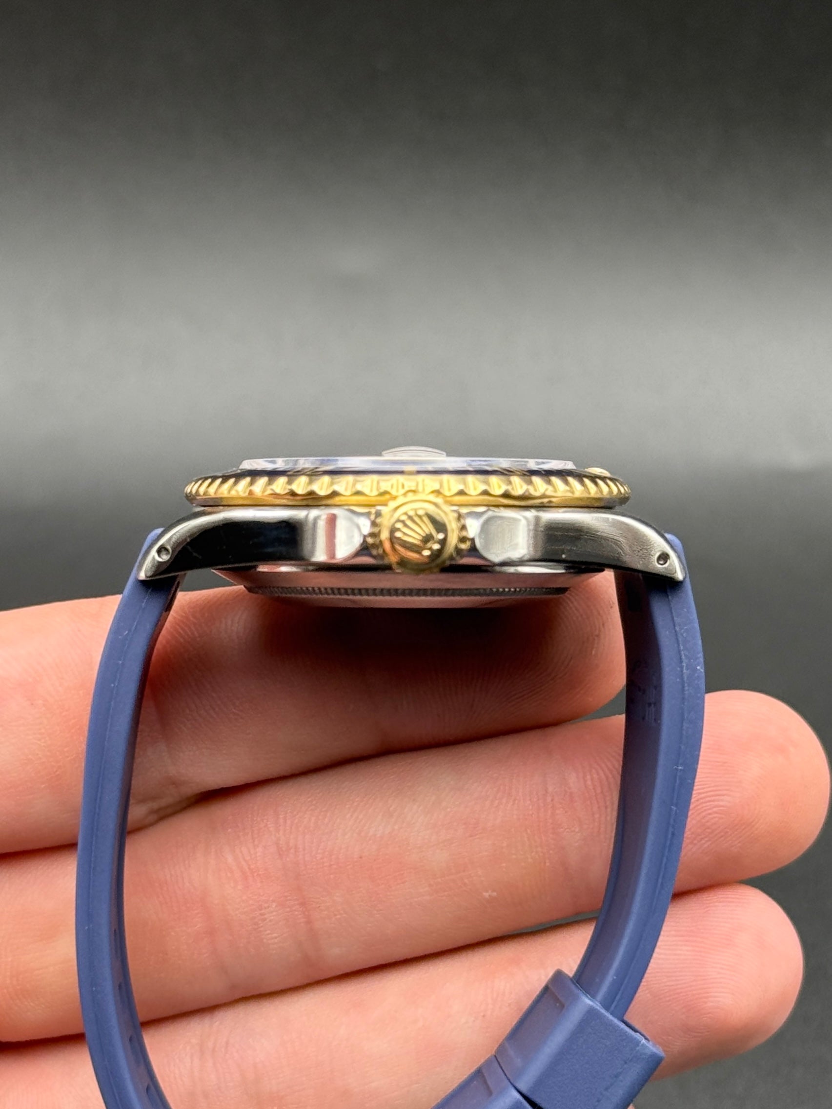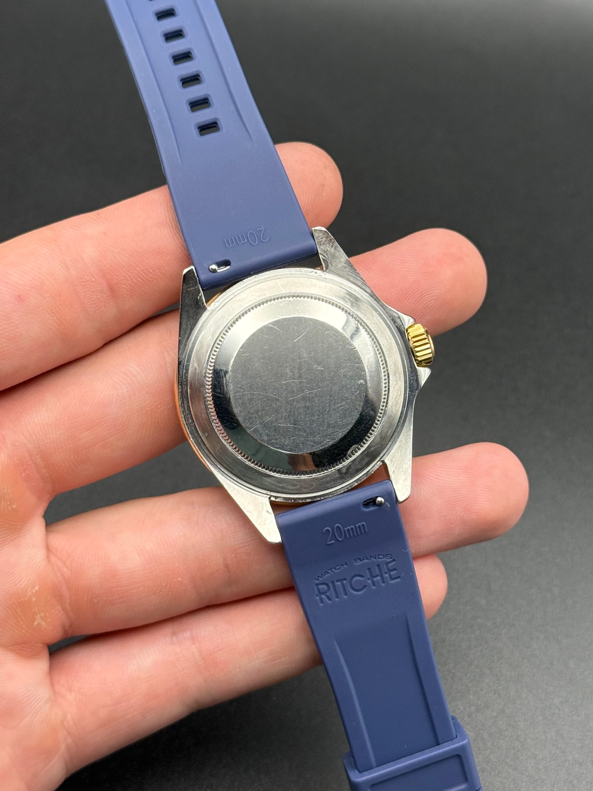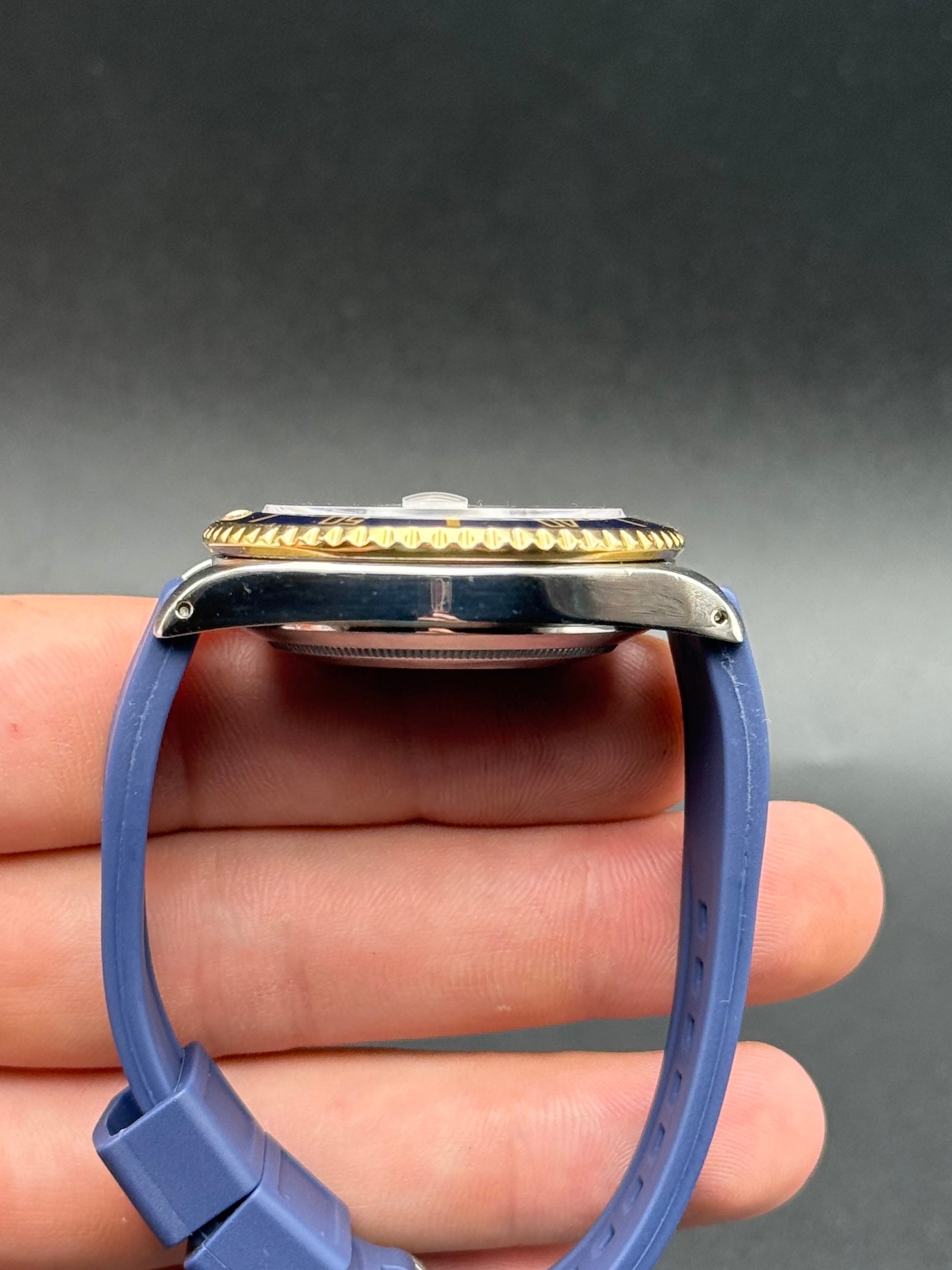 For sale is a Sub D8 born stainless steel, converted into a two-tone using Luminova parts—all active lume. Watch runs okay—could benefit from TLC. Crystal has two small nicks near 12. If wanted, the crystal can be swapped at no cost. Service available on request. Comes as head on strap.
